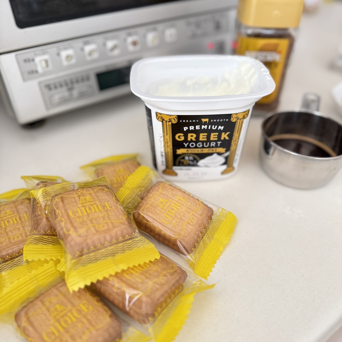 ギリシャヨーグルトにビスケットをさすスイーツも試してみました。