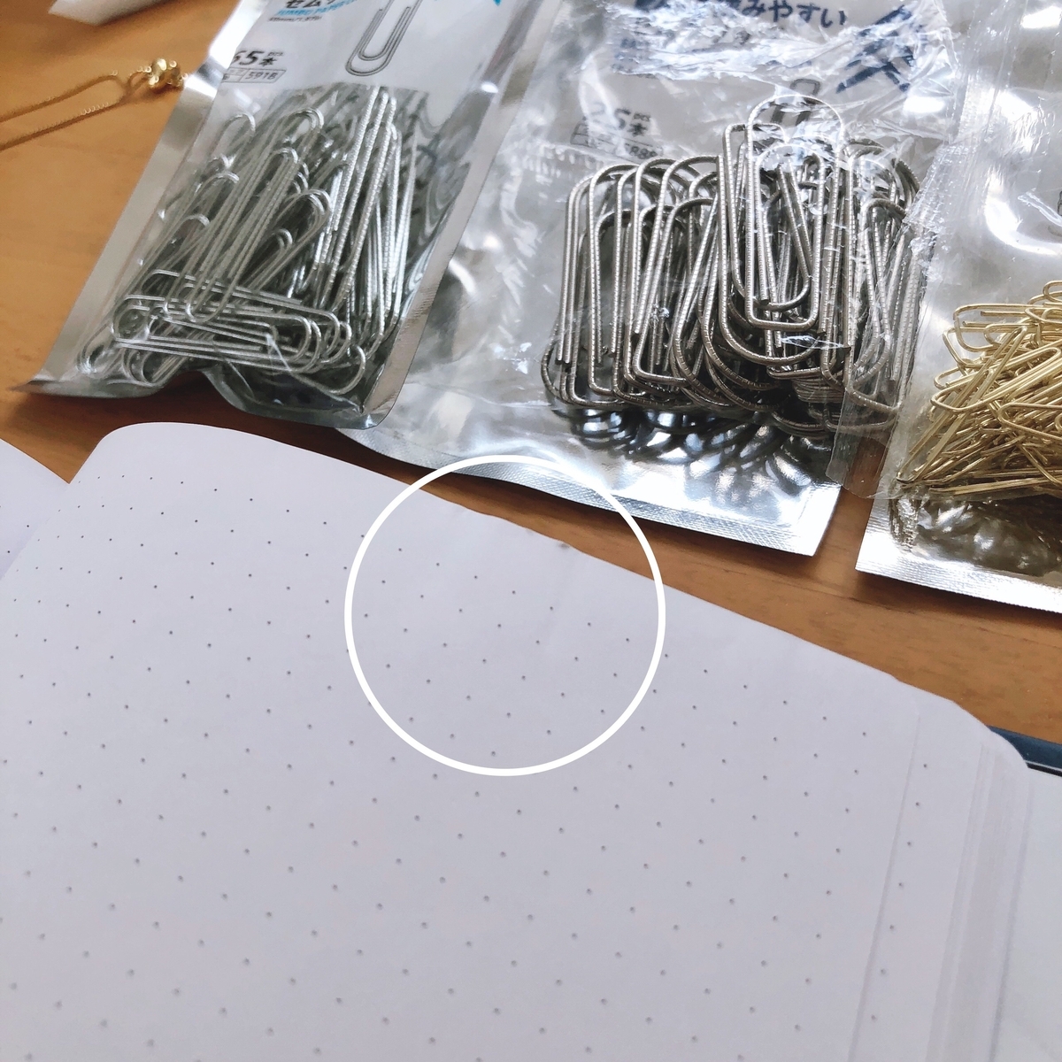 写真(右):「ワイド挟みやすいゼムクリップ」は、実は一番ブックマーカーに向いてそうな気がしていましたが、しっかりしている分、紙を挟んだ後、ノートに跡が残りやすく(白丸で囲んだところ)これは無いかなと思った点です。