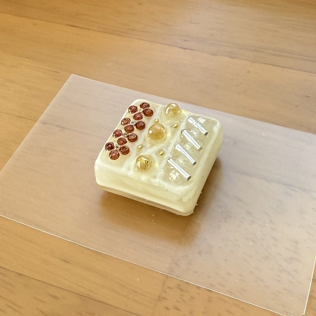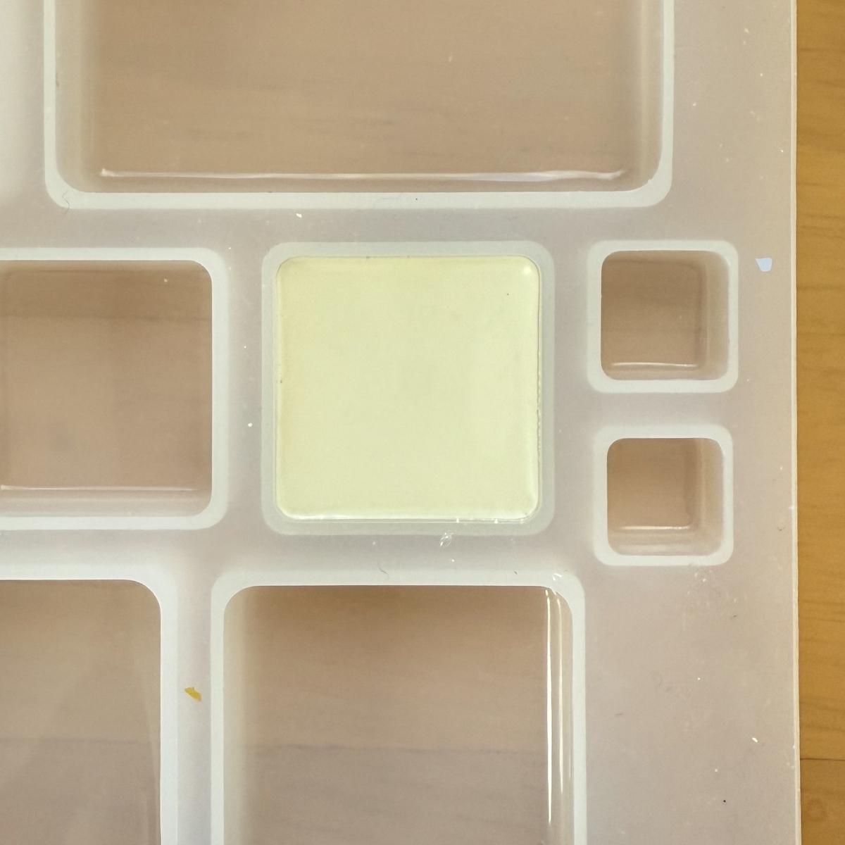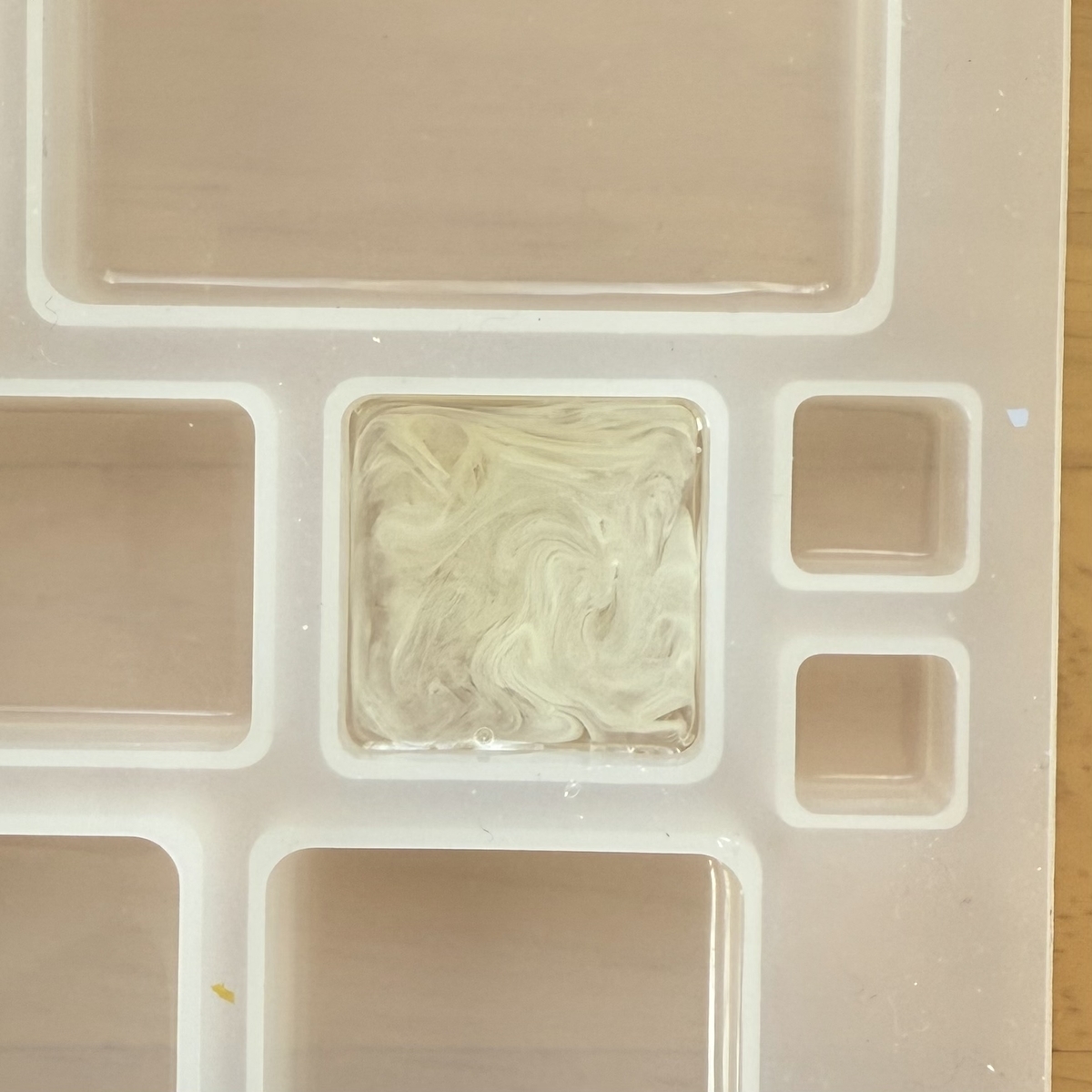 3層目はクリーム色のレジン液を薄く入れて硬化、4層目に透明のレジン液をモールドのふちまで流しいれて硬化します。