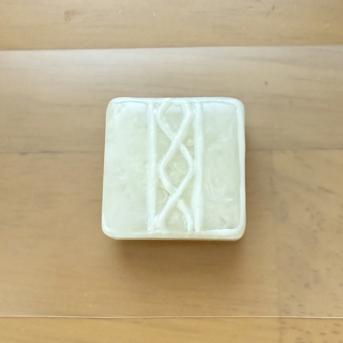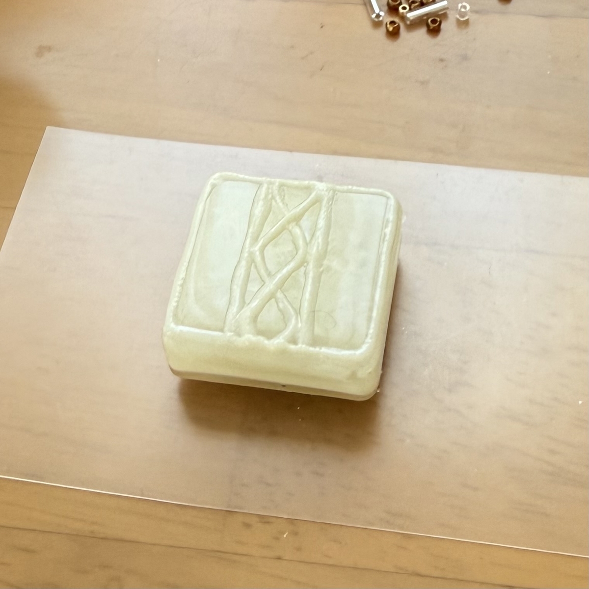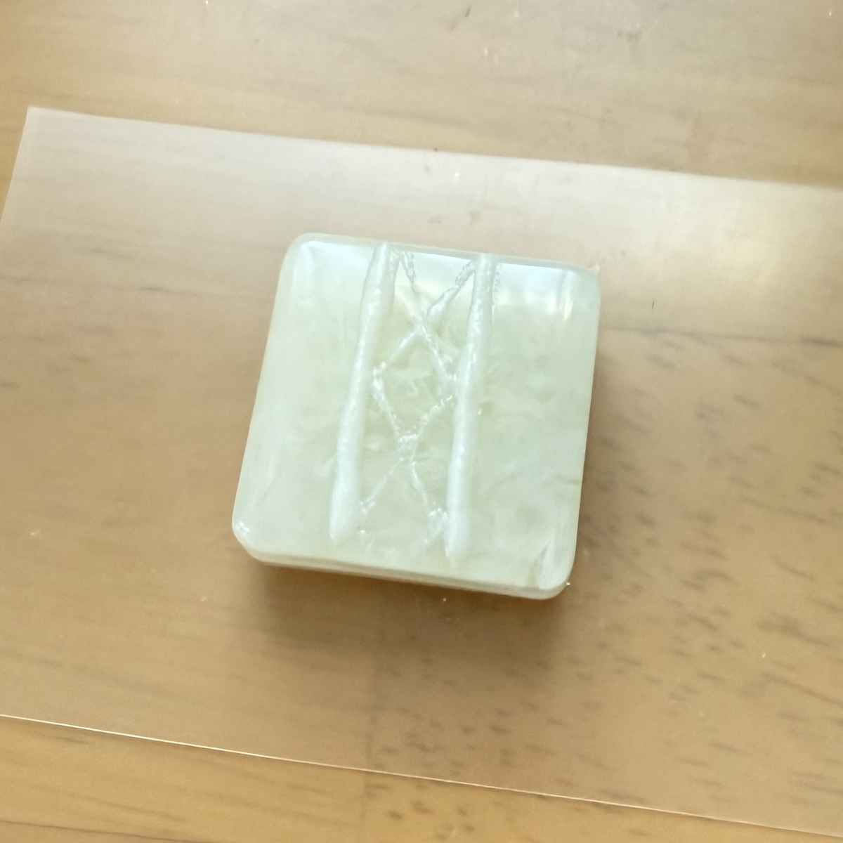 3層目はクリーム色のレジン液を薄く入れて硬化、4層目に透明のレジン液をモールドのふちまで流しいれて硬化します。