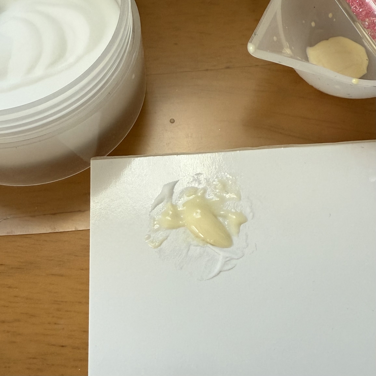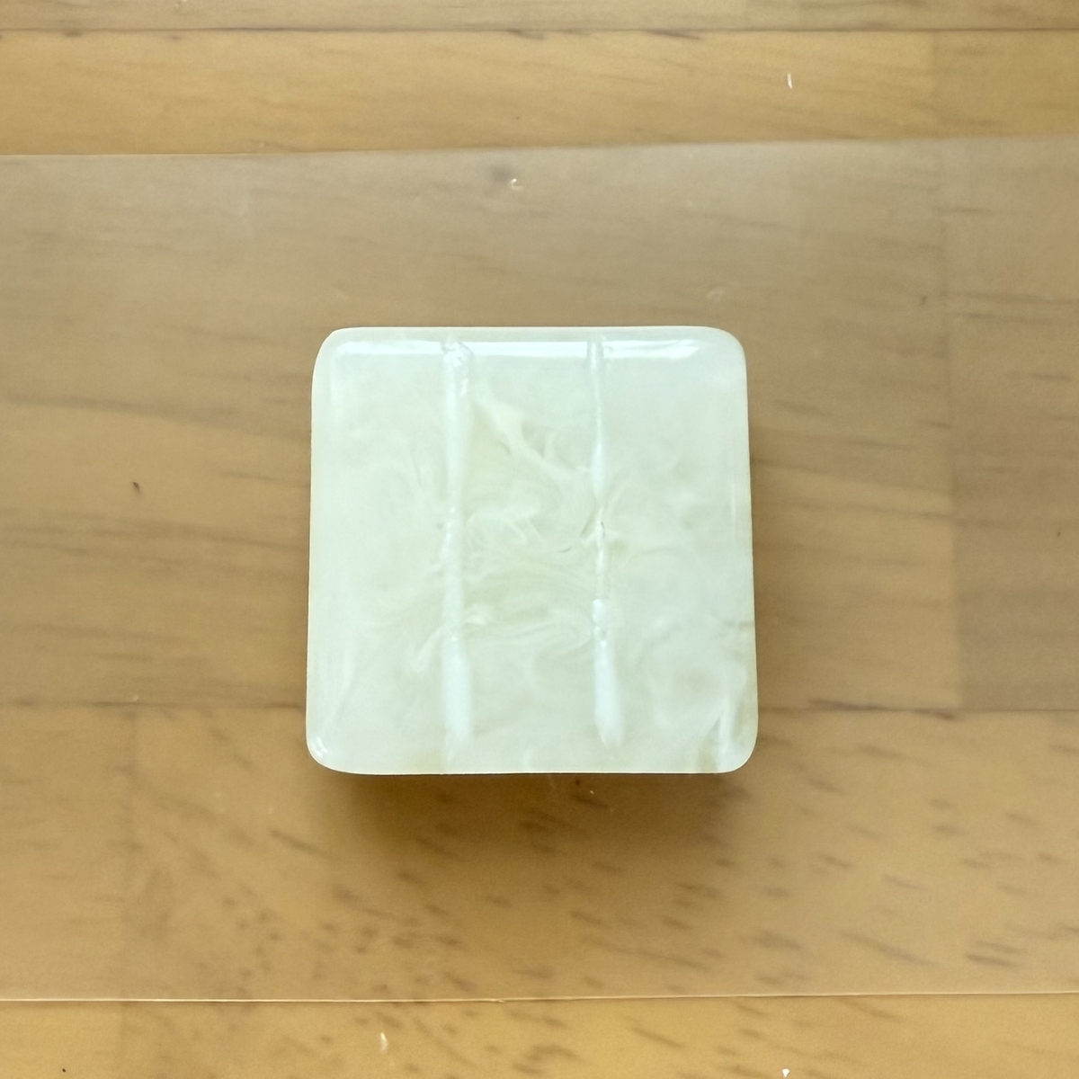 透明の低粘度のレジン液にクリーム色に作ったレジン液を数滴落として静かにゆっくりと混ぜて硬化します。