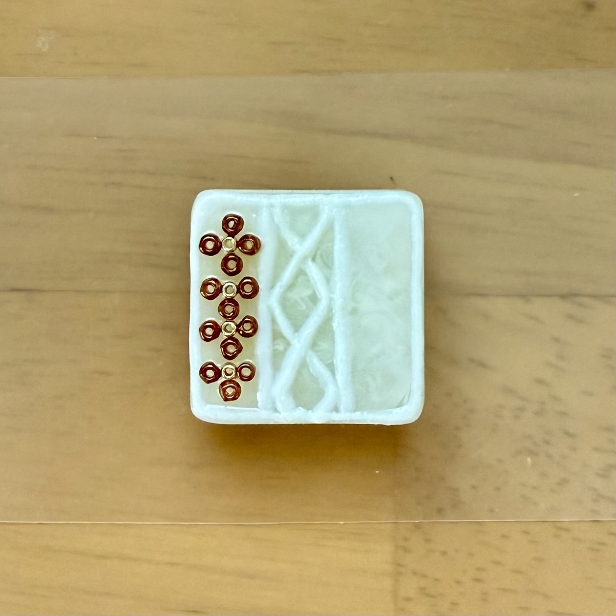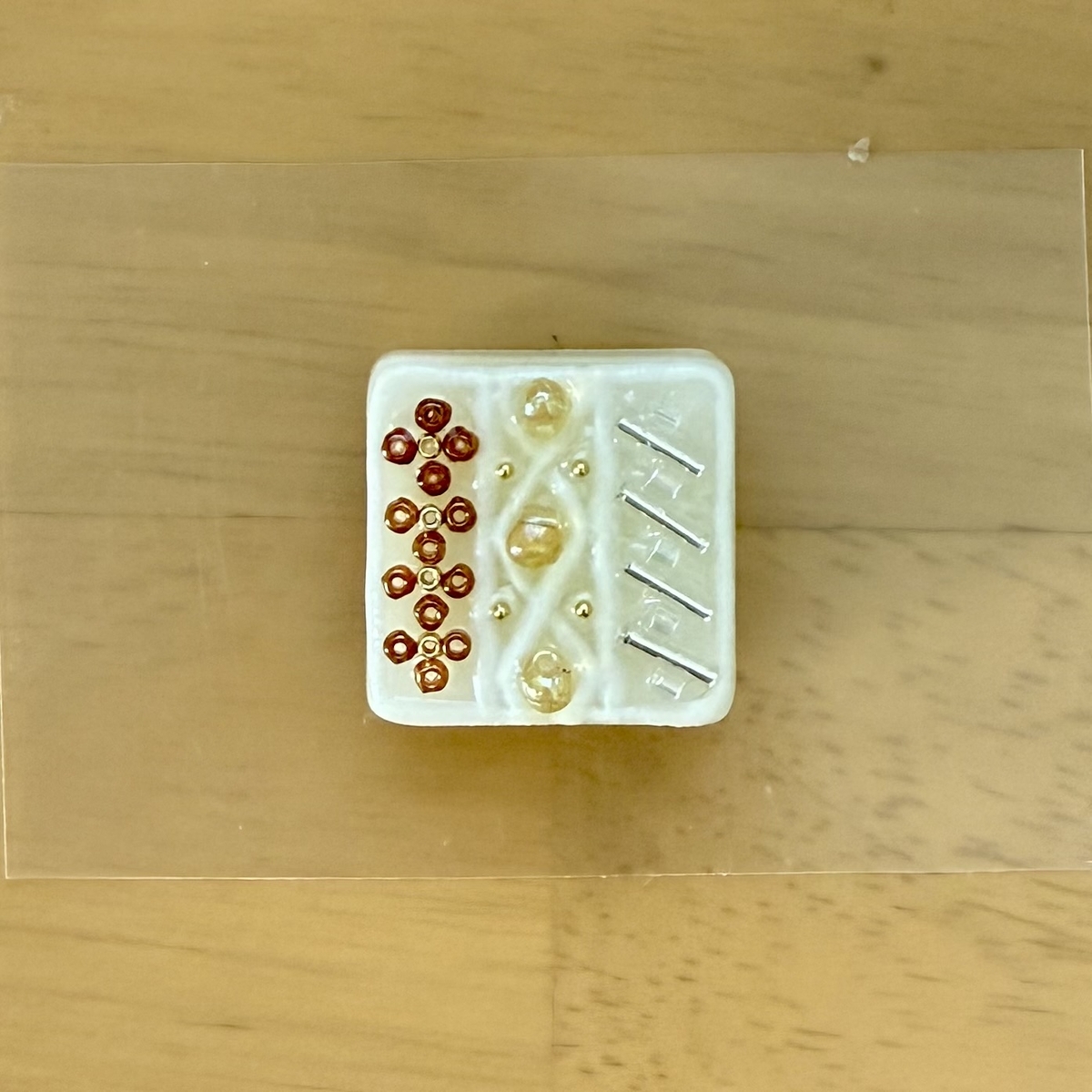 ニット柄をイメージしながらレジンで模様を描き、その隙間を埋めるようにビーズを配置しました。