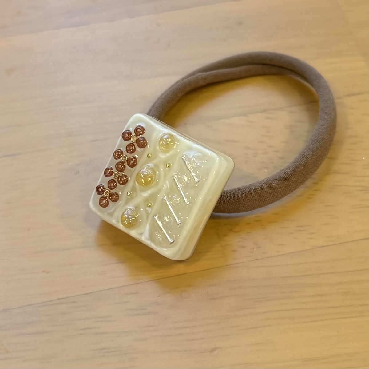 最近、「好きなもの同士を掛け合わせて、オリジナルな作品を作りたい」と思い立ち、スクエア型のヘアゴムを作ってみました。