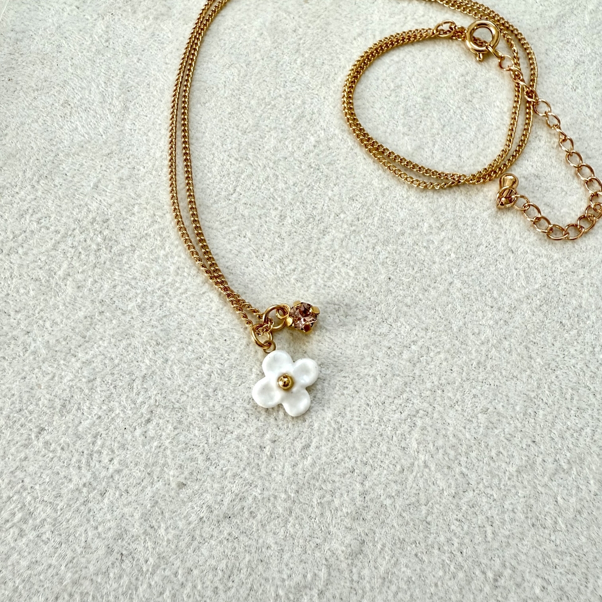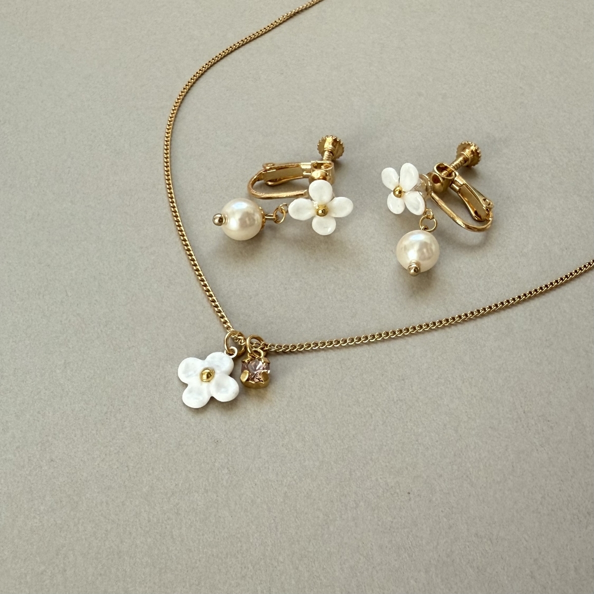イヤリングを作っているうちに、「このモチーフ、ネックレスにしたも素敵かも!」と思い立ち、ネックレスも作ってみました。小さなビジューもつけて試してみたら、とても良い仕上がりに!ネックレスにはイヤリングと同じく、きれいで上品な印象のお花モチーフを使いました。