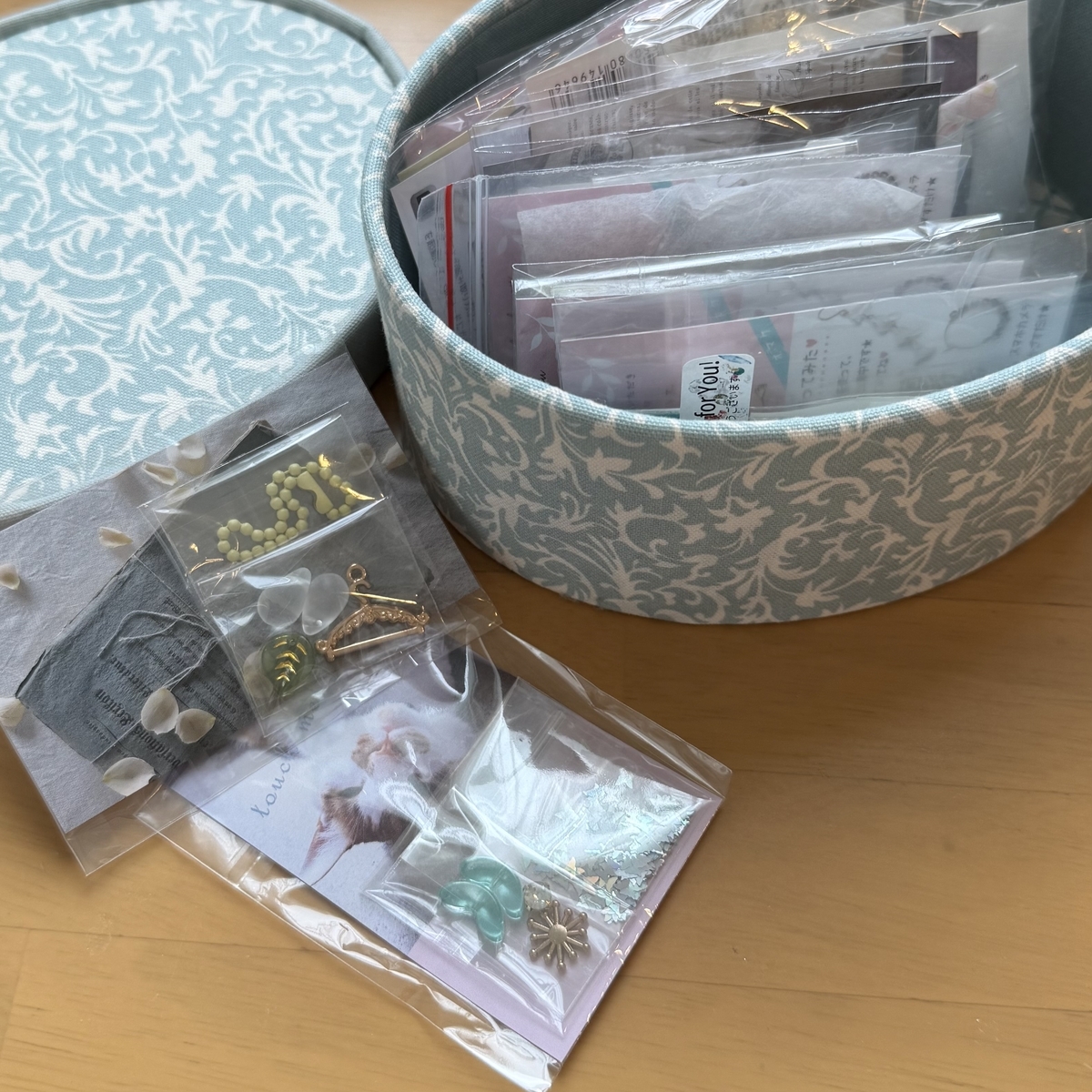 自分でカルトナージュして作った箱に、レジンショップでいただいたおまけを収納。なかでもGreen Oceanさんのおまけは毎回「こんなに可愛いものもらっていいの!?」と驚きます。いつかこのおまけで作品を作りたいな。